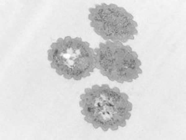 这是四个导线状细菌的切片图。每一个细菌的表层细胞膜下包埋了15根细丝。