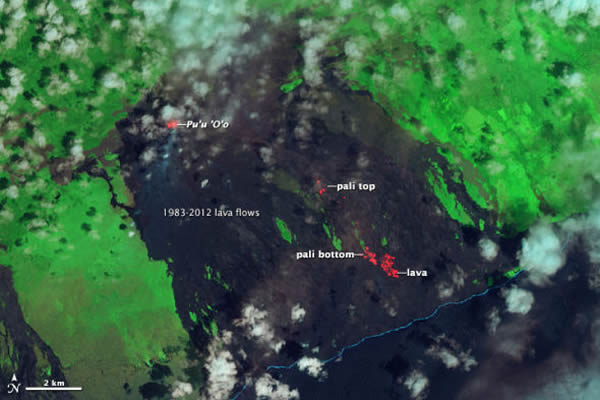 在这幅照片中,旧熔岩呈现为暗色,而新的熔岩呈现为红色。植被呈现为明亮的绿色,云是白色或青色的,海洋是深蓝色的。尽管Pu'u“O'o火山口部分被云层遮蔽,但仍然显露出鲜红色,这是由于其内部灼热的熔岩湖的缘故。熔岩流通过熔岩管从火山口流向海岸,但其中有一些岩浆再度出现在斜坡顶部(斜坡将基拉韦厄火山的东部裂缝与海岸平原隔开)。