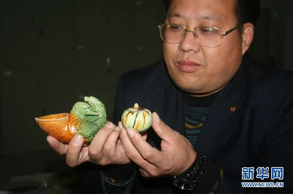 河北省磁县文物保管所副所长李江向记者展示磁县古墓群唐代墓葬中出土的鸳鸯水注