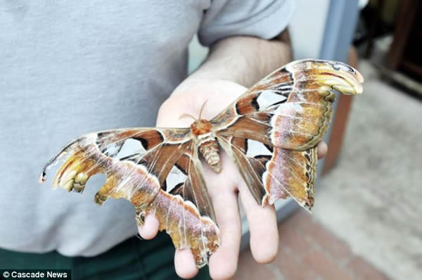 英国每日邮报报道,近日在英国兰开夏郡发现了一只巨型阿拉特斯蛾,翅膀尖之间的距离长达1英尺(30.5厘米)。这种巨型阿拉特斯蛾一般出现在东南亚,尤其是马来西亚。然而位于英国斯波顿的布莱克默家族却在自己后院发现了这样一只距离本土6000英里的巨型阿拉特斯蛾。这只巨型蛾目前生活在英国博尔顿的动物世界,已经产卵并孵化出毛毛虫。这只巨型蛾被发现于斯波顿某户人家的后院里。