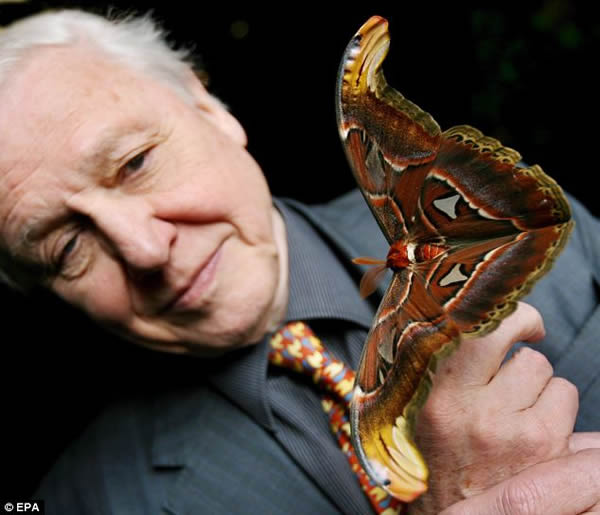 更不可思议的是,它还产卵了。”这只蛾于8月中旬立图中伦敦博物馆的戴维•阿滕伯勒(David Attenborough)正手拿一只阿拉特斯蛾。“即被带回动物世界,并放在一个更大的容器里。两周后,它孵化出毛毛虫,后者现在已经长到5英尺长。莱克陶尔补充道:“人们常常能看到阿拉特斯蛾,但因为后者体型太过巨大,人们往往不敢相信自己的眼睛。这种蛾在野外几乎无法存活,在后院发现它的存在实在是令人讶异。”