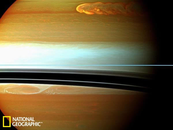 从这张合成于2011年的图片中可以看到,一场巨大的风暴(照片的右上角)正在形成。波克说,“这是我们所观测到的土星大气层中发生的最大规模的风暴。不过这也为我们提供了一个对土星大气层进行研究的绝佳机会。”