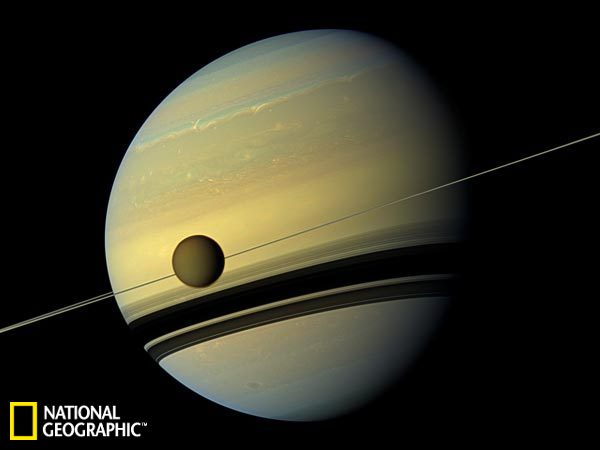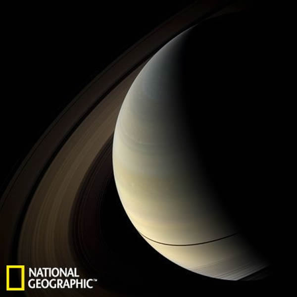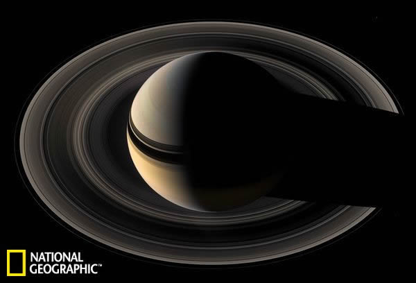 在2007年拍摄的一张照片中,土星的光环在其表面投下了细长的阴影。这张照片是由美国宇航局的“卡西尼”号太空船从一个在地球上无法看到的角度拍摄的。科学家使用了红色、绿色和蓝色的滤镜合成出了接近这张自然色的照片。这张照片拍摄于土星北半球上空约100万千米的地方。科罗拉多州博尔德市空间科学研究所“卡西尼”号太空船图像处理团队负责人卡洛琳-波克说,“在处理这些图片的过程中,我注意到土星大气层呈现的颜色与2004年我们刚到达那里时的颜色相比已经产生了一些变化。对土星进行的近十年的观测向我们展示了土星的外貌变化,也可以看见土星的颜色随着它的季节更替产生的一些改变。”在2017年完成了它的使命之后,“卡西尼”号太空船将坠入这个由气体形成的行星,以免对土卫六和土卫二产生污染。