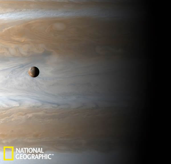 该照片拍摄于2001年,木星布满火山的卫星正围绕着木星进行公转。“卡西尼”号太空船在前往土星的过程中路过木星时拍摄到了这幅照片。在图中,木星的卫星看起来距离木星非常近,实际上它们之间的距离大约为35万千米,这与月球和地球的距离差不多。