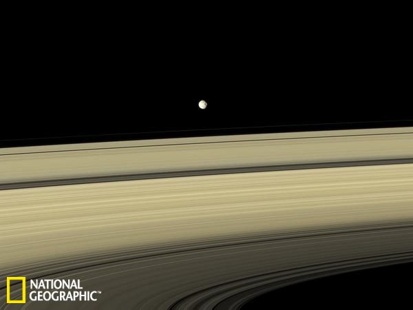 在“卡西尼”号太空船于2007年拍摄的这张照片中,土星的卫星之一-土卫一似乎就挂在土星的光环上。肉眼可以看到在土卫一右侧有一个巨大的陨石坑。这个陨石坑的直径大约为140公里,是在很久之前被周围的一颗卫星撞击形成的。