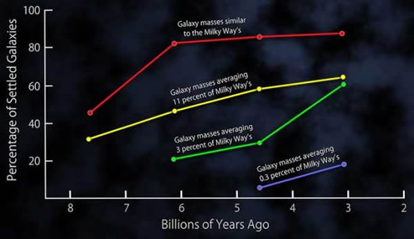 银河系也经历过从混乱星系到稳定星系的转变过程,并逐渐形成了现在的形态。这样的星系形态和太阳系的形态类似。在过去的80亿年中,星系与星系间的融合数量大大减少。同时,恒星产生的速率和超新星爆发的数量也随之减少。科学家认为这些因素也是星系慢慢变得趋于稳定的原因。