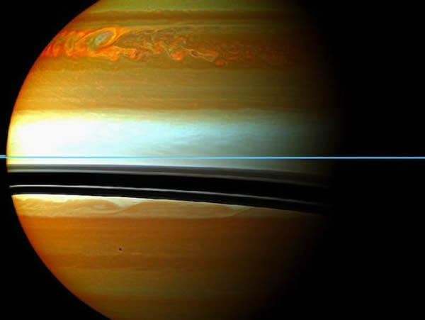 这张照片由卡西尼探测器拍摄,展示的是在2010年至2011年间肆虐整个土星北半球的巨型风暴系统。在这一风暴系统逐渐平息之后,科学家们发现其在肉眼不可见的红外波段继续存在着