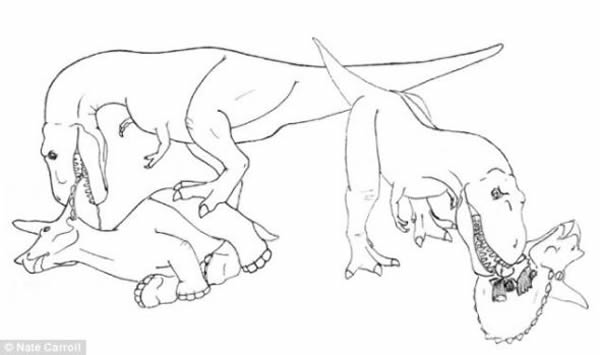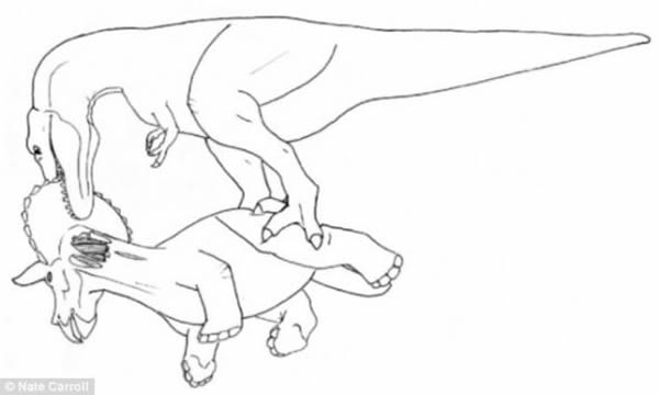 通过进一步观察分析,研究人员发现深深的平行沟槽,说明霸王龙可能用牙齿和爪子撕拉三角龙颈饰,调整三角龙的姿势