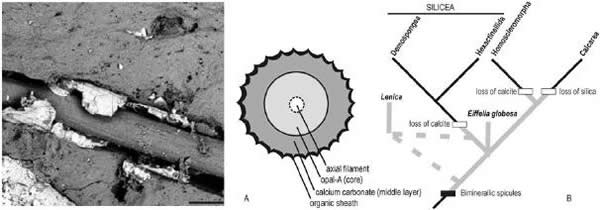 疑难海绵 Lenica 骨针的在电子显微镜下拍摄的照片。A:海绵骨针结构的复原图。B:早期海绵骨针演化的多种可能性。比例尺:200 微米。