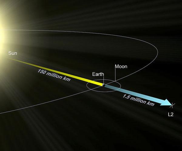 太阳-地球的第二拉格朗日点位于地球背向太阳的一侧,距离地球大约150万公里(是地球和月球之间距离的5倍)。鉴于L2上的热环境非常稳定,有利于提高望远镜的观测效率,NASA的多颗探测器都被安置在那里。例如对宇宙微波背景辐射进行测量的“威尔金森微波各向异性探测器”(WMAP)、普朗克卫星(Planck satellite)以及斯必策红外望远镜(Spitzer Space Telescope)等。