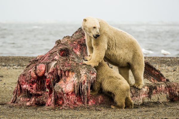 一头成年北极熊和幼崽正爬上弓头鲸的颅骨,寻找所剩无几的残肉。这个头骨已经被二十几头饥肠辘辘的北极熊光顾过,并饱经卡克托维克的风雨侵蚀。