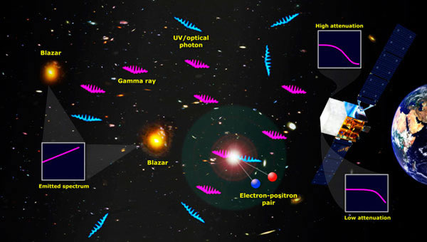 爱杰罗和他的小组并没有直接对“河外背景光”进行测量,而是通过对美国宇航局的“费米伽马射线太空望远镜”对遥远黑洞测量的结果进行分析得到的。费米望远镜对来自一种叫做“耀变体”的天体的光线进行了观测研究。这类天体能够通过居于中央的巨大黑洞吞噬大量物质而发出大量光线。”