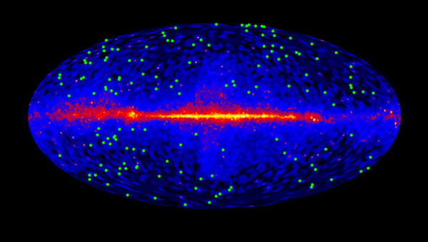 这幅图显示了此次研究所利用到的150颗耀变体(绿色点)