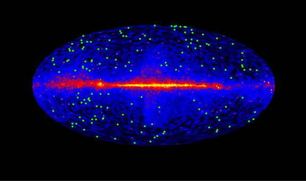 “河外背景光”(EBL)研究中所用的150个耀变星体(绿色点)
