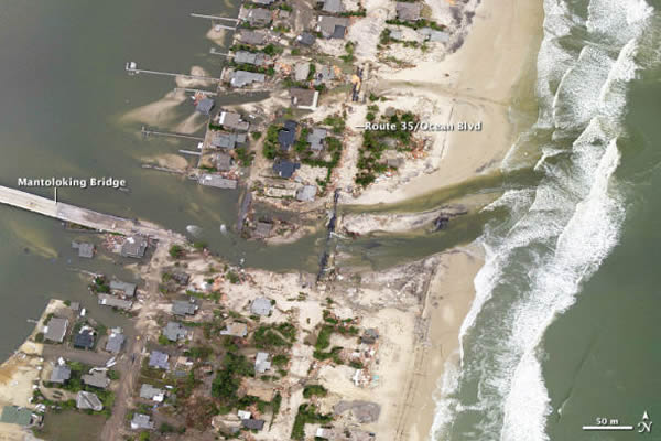 美国宇航局地球观测站公布了一组航拍照片,展示了美国新泽西州海岸线在飓风桑迪过后发生的变化。