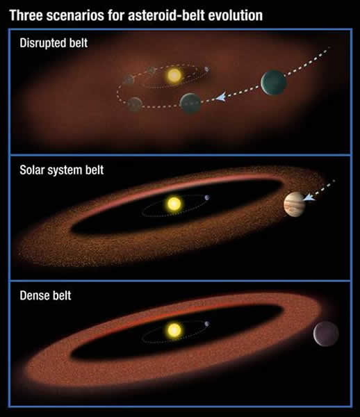 有迹象表明小行星带可能孕育着生命。上图为类似木星大小的行星穿过小行星带的情景,这样使得岩石分散,而抑制生命形成的可能。中图为类似木星大小的行星略为和小行星带搭界的情景,暗示可能会出现生命。下图为巨行星远离小行星带的情景,这样的小行星带质量变大,其内部物质可能会轰炸行星,不可能会有生命存在的迹象。