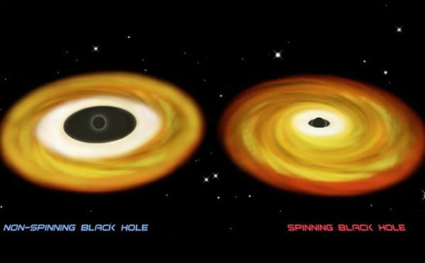 黑洞通常都会以非同寻常的速度旋转,并影响到周围宇宙空间的结构,一个被命名为GRS 1915+105的黑洞位于天鹰座方向,距离地球大约3.5万光年,以每秒950转以上的速度旋转。图中显示了黑洞在旋转与不旋转情况下周围时空的变化,对于没有旋转的黑洞,白色区域较大,而右边旋转黑洞的白色区域较小,从这点可以推测旋转黑洞的气体可以距离事件视界非常近的轨道运行,因此其半斤也更小一些。如果物质落入黑洞的吸积盘,不可能存在逃逸的可能,旋转将以每小时3.33亿英里的速度进行,大约为5.36亿公里每小时,几乎达到了光速的一半。