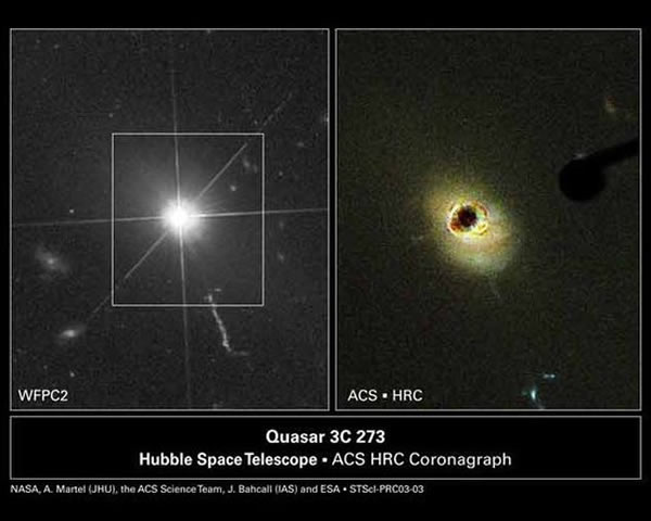 尽管黑洞的引力可以使得光线都无法逃脱,但是黑洞可以组成类星体的核心结构,而类星体却是宇宙中最强大、而且最有活力的天体。本张图显示了在2003年哈勃空间望远镜拍摄的类星体3C 273的图像,右边的图详细揭示了类星体的一些关键信息,从图像中可以看书中央较为明亮的光线被阻挡了一部分。由于星系中的黑洞可以吞噬周围气体和尘埃物质,因此在这个过程中可以喷射出巨大的能量,我们在图中可以看到的天体就是类星体3C 273,距离我们大约30亿光年。