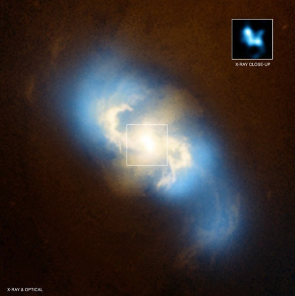 在NGC 3393星系中存在着两个异常活跃的黑洞,科学家认为其中存在两个较小黑洞合并的事件,这两个黑洞由于距离太近,而其中一个黑洞正在消耗并吞噬另一个黑洞所存在星系的核心物质。本项观测首次发现了两个黑洞的合并事件,研究人员通过是同美国宇航局钱德拉X射线空间望远镜探测到的两个黑洞一个具有3000万倍太阳质量,另一个至少有1百万倍太阳质量,彼此距离仅490光年。