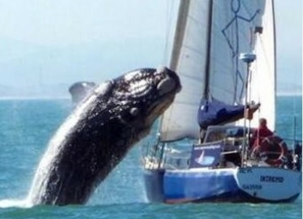 南非印度洋海域一条巨型鲸鱼突然从水中跃起砸中船只
