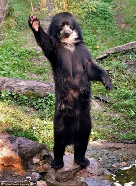 德国的动物园内有一只有趣的黑熊,在吃完饲养员给的食物后,它肚子还饿想再吃点。可是,黑熊不用嚎叫声吸引人们注意,而是“礼貌地”招手,仿佛在说,“嘿,服务员,我还要加点菜。”