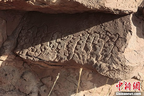 岩刻六字真言:“嗡、嘛、呢、叭、咪、吽”。