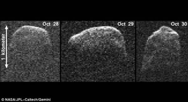 这三张图像是使用美国宇航局戈德斯通70米天线获取的雷达图像,显示这是一颗直径大约1.6公里的近地小行星