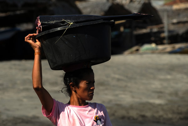 10月28日,印度尼西亚东努萨登加拉省兰巴塔岛上的拉玛莱拉村,祖孙三代准备用小船出海。