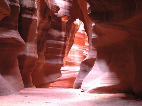 羚羊峡谷的地质构造是著名的红砂岩,谷内岩石被山洪冲刷得如梦幻世界。羚羊峡谷的出口只有一人多宽,山洪经常从这里以惊人的力量喷涌而出。