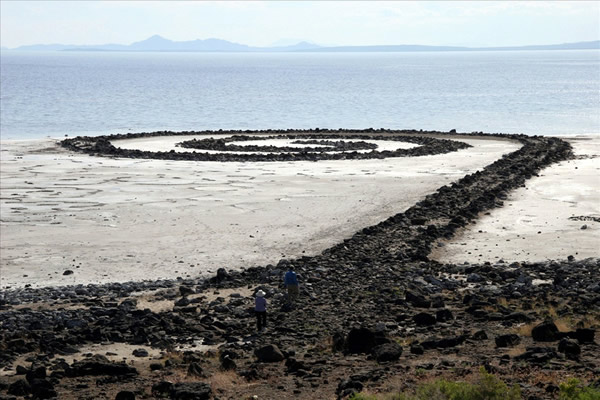 大地艺术螺旋形防波堤,位于布里格姆(Brigham)以西30英里处,在大盐湖的北部。这个特殊的雕塑由艺术家罗伯特·史密森于1970年用玄武岩和泥土创造而成。螺旋长1500英尺(450米),一直延伸到湖深处。之后,由于湖面上升,这个螺旋形防波堤沉于水下,1999年又重出湖面。