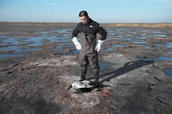 一名志愿者站在湿地里,默默注视着被打捞上来的东方白鹳尸体。