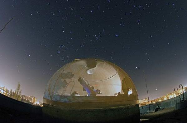 位于匈牙利中部城市Szekesfahervar的天文台附近,经验丰富的天文摄影家拍摄到了精彩夜空图像,拍摄时间为2012年2月21日。图中最引人注目的是天文台观测圆顶结构,上方则是精彩的星迹。目前,大多数的观测站都远离大都市,以减少光污染对观测活动的影响。