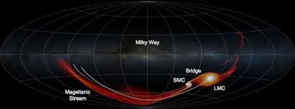 大麦哲伦星云(LMC)和小麦哲伦星云(SMC)发生碰撞的时候,大麦哲伦星云从它的邻居那抢夺了一连串的星球。