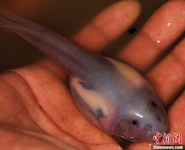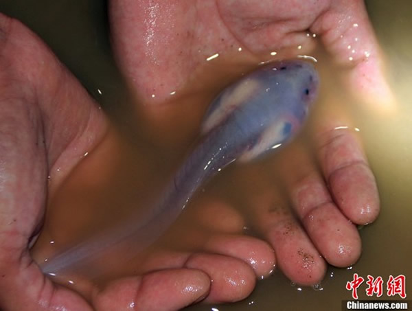 四川筠连县神羊洞内发现疑是红点齿蟾的“透明鱼” 来源: 神秘的地球 时间:2012年11月14日 10:24 四川筠连县神羊洞内发现疑是红点齿蟾的“透明鱼” 四川筠连县神羊洞内发现疑是红点齿蟾的“透明鱼” 连日来,四川筠连县神羊洞内发现“透明鱼”(长约15厘米)引起大家关注,发现的“透明鱼”疑是红点齿蟾,是一种为喀斯特地貌溶洞中罕见的穴居物种, 因长期穴居生活,蝌蚪皮肤色素较少,又被称为“透明鱼”。该物种,主要分布于海拔1000-1790m的石灰岩洞穴及周边地带,《中国物种红色名录》将其 列为易危物种。 中新社 陈勇 上一篇 下一篇 TAG: 红点齿蟾