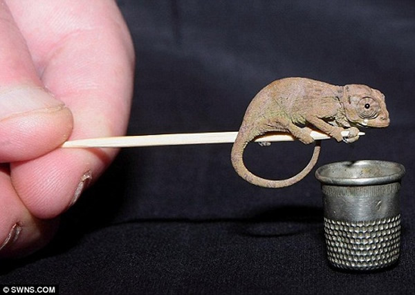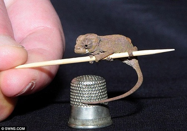 这只刚出生的小变色龙体长仅3厘米,身体仅有一个硬币那么大。据照顾小变色龙的工作人员说,小变色龙目前的食物是果蝇和蟋蟀。三角变色龙长成后体长可超过30厘米,孵化期大约16周,目前仅在在非洲艾伯丁裂谷地区可以发现它们的踪迹。