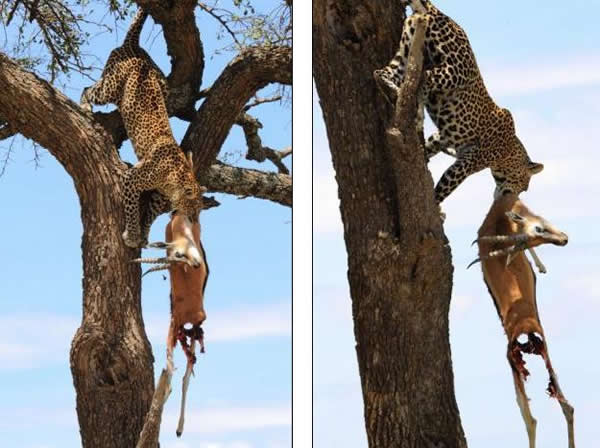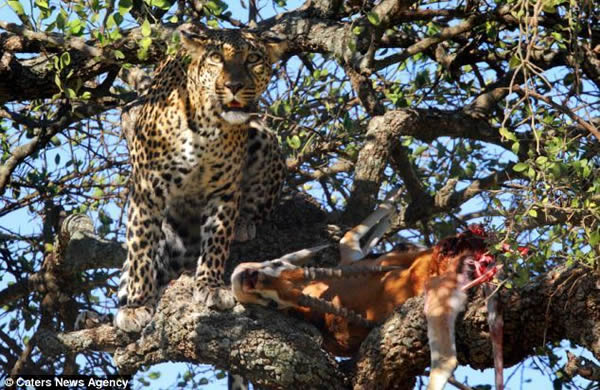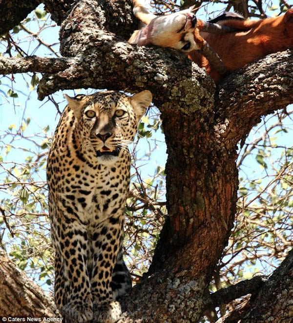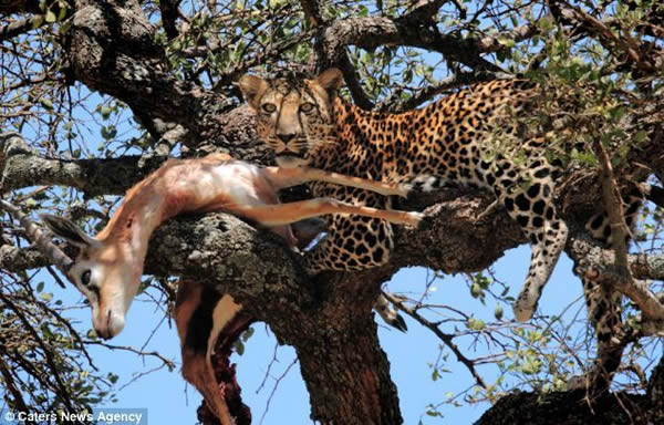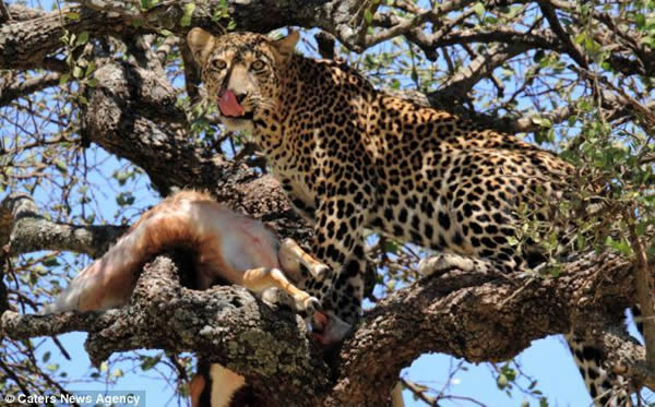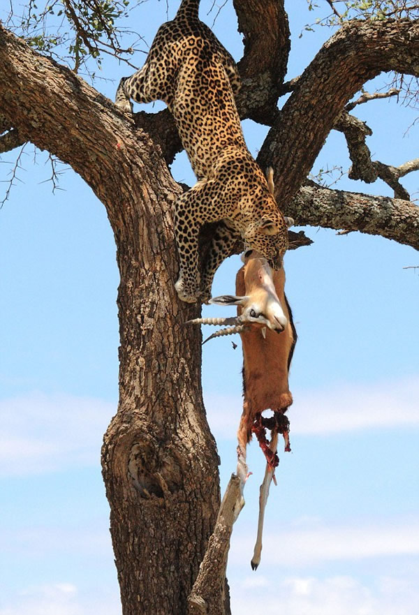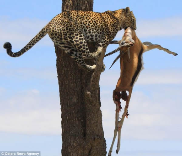 摄影师跟了这个捕食者一会儿,然后看到它突然停下来,在一棵树旁环顾四周,接着以令人敬畏的速度爬上去。这位摄影师说:“我们只是目不转睛地看着它,并没有注意到有头汤姆森瞪羚的尸体悬挂在靠近树顶的地方。它一定是在昨天晚上杀死这头瞪羚。