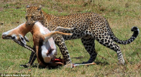 这只雌豹吃了一小部分,然后好像把剩余的瞪羚尸体带回家,给它的两个孩子享用。
