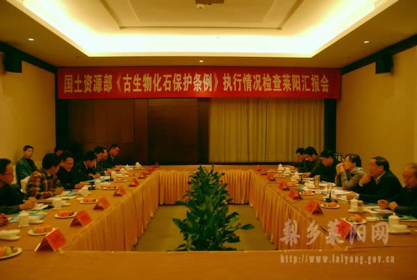 11月15日下午,在市领导尹鹏、邹常厚的陪同下,检查组首先在金山国际酒店召开古生物化石保护工作座谈会议,市委副书记、市长尹鹏主持了会议并作重要讲话。尹鹏说,莱阳市古生物化极其丰富,历年来,我市高度重视古生物化石保护工作,相继开展了一系列的保护工作,取得了明显成效。下一步,莱阳市将以此次专项检查为契机,认真贯彻落实《古生物化石保护条例》,进一步加大古生物化石保护工作力度,扎实落实工作措施,努力使我市古生物化石保护水平提升一个新台阶。会上,副市长邹常厚向检查组汇报了莱阳市《古生物化石保护条例》执行情况,检查组还观看了《莱阳申报国家地质公园宣传片》并就莱阳市古生物化石保护情况做了交流发言。