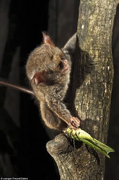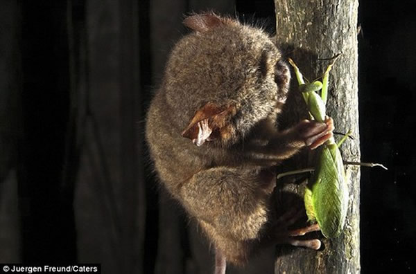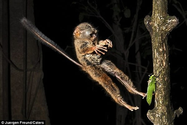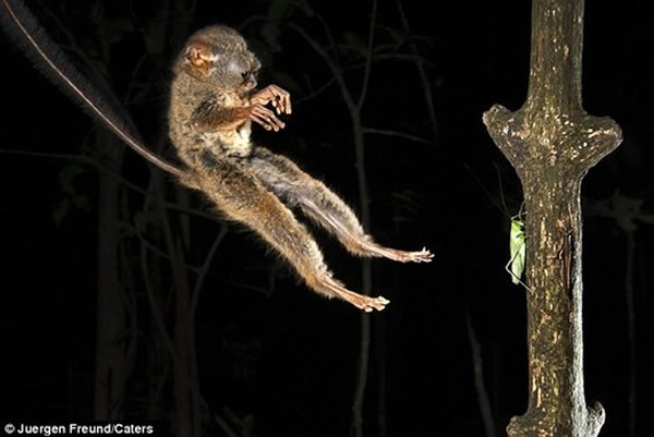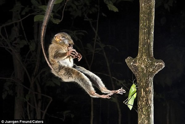 据英国《每日邮报》11月16日消息,澳大利亚野生动物摄影师于尔根·弗罗德(Juergen Freund)带着相机来到印度尼西亚唐可可国家公园(Tangkoko National Park)。弗罗德选择一个位置,等着眼镜猴醒来。他的等待没有白费,因为他拍下眼镜猴纵身擒蚱蜢的精彩照片。弗罗德打趣说,眼镜猴的大眼睛与它的体型有 点不成比例,但身手还不错。