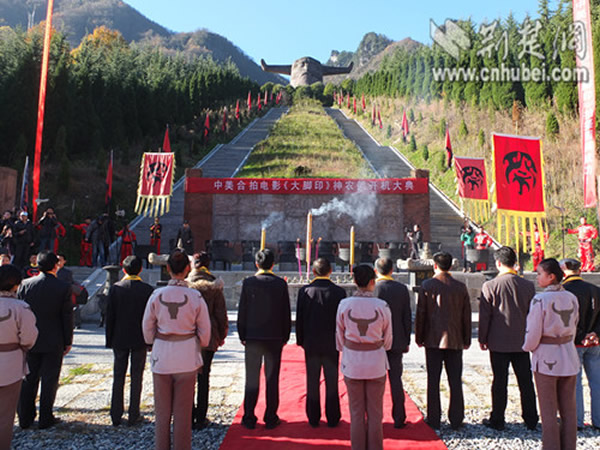 神秘的神农架以“野人传说”著称,如今野人传说即将搬上银幕。11月18日,由湖北广播电视台、深圳帝影星韵国际影视公司、美国维泽埃克影视等联合摄制,中国电影合作制片公司监制的中美合拍电影《大脚印》,在神农架林区神农坛景区举行隆重开机仪式。