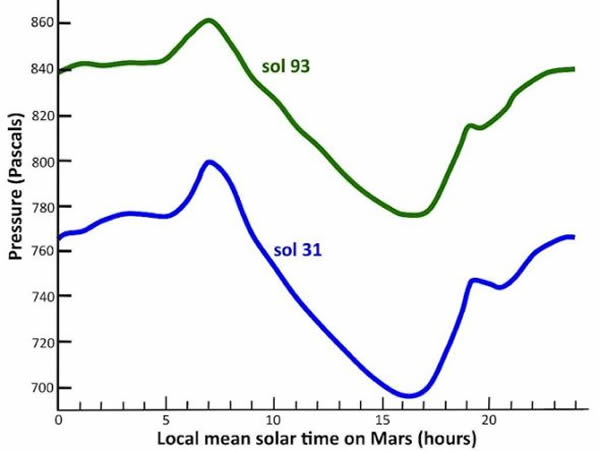这是在数月时间内好奇号监测获得的气压变化数据,此时火星南半球正从较寒冷的冬季向较为温暖的初春转变
