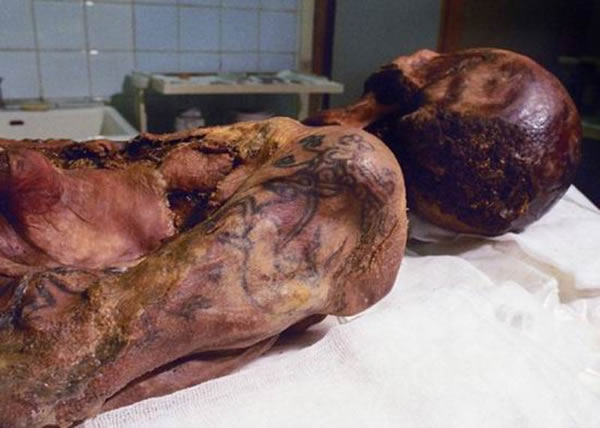 这具干尸被称为“阿尔泰公主”,是1993年发现的一具2500年前的女性尸体。虽然从肩膀沿伸至手臂的纹身图案的含义仍不清楚,其中鹿图案纹身也出现在树干棺材图案上。她精美的头饰和陪葬物品暗示着她具有较高的社会地位,在寒冷的俄罗斯冻土高原,历经2500年她的皮肤和骨骼仍保存完好。