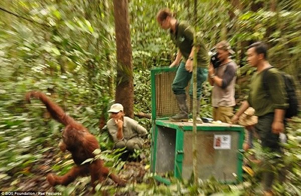 此次放归自然的猩猩包括5只成年母猩猩和其他16只小猩猩。这些猩猩此前都由印尼婆罗门的猩猩保护机构照顾,这次是它们第一次被放归自然。工作人员用笼子把猩猩抬到丛林中,而首次回到野外的猩猩们也都激动不已,它们狂喜振臂,一路跑向丛林,跟随拍摄的摄影师几乎跟不上它们的脚步。
