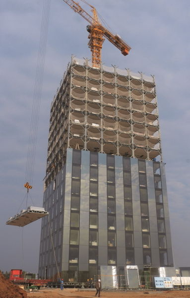 2011年,长沙远大科技集团凭借15天内建造一座30层大楼登上各大媒体的头版头条,图为当时正在建设中的酒店大楼