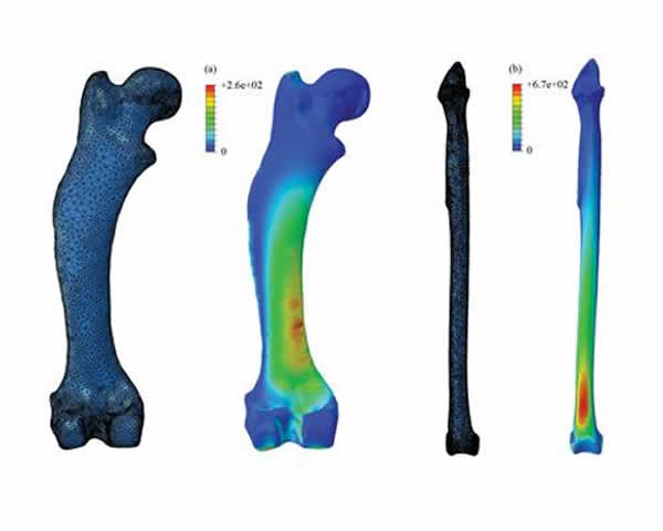 在对动物的腿骨模型进行载荷应力测试时,科学家们发现,对作用力进行位置和方向上很小的改变,骨骼的弯曲度都会发生很大的变化。科学家们指出,这意味着以前利用假定圆柱形骨骼的方式计算动物的重量时,会使得计算结果比实际数据高出1.42倍。