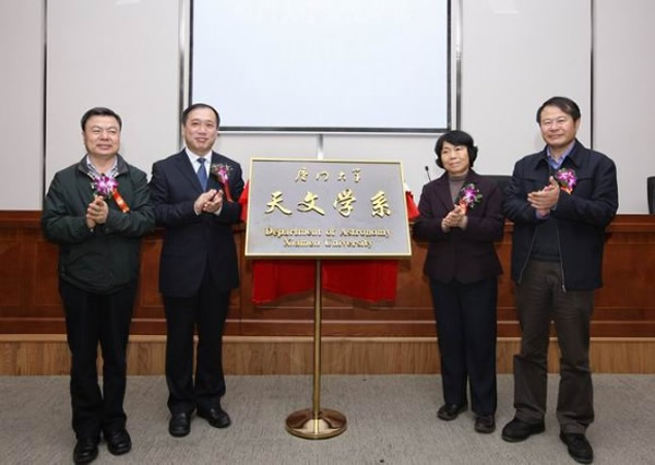 杨振斌、赖虹凯、金能明、吴晨旭、中科院院士陈建生、方成一同为厦门大学天文系揭牌。