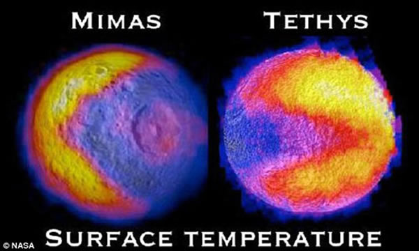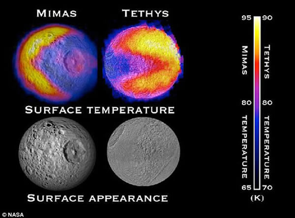 卡西尼探测器在土卫三表面探测到温度差异,科学家认为这种多样性很可能与土卫三表面构成物质的差异有关。科学家解释称,较明亮的卫星表面区域可能温度高于其它区域。