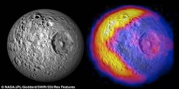 卡西尼探测器观测到土卫三热成像图像呈现“吃豆人”结构,两年前曾发现土卫一也是“吃豆人”星球