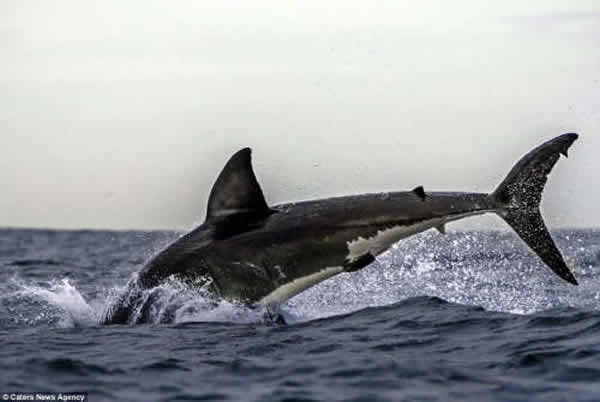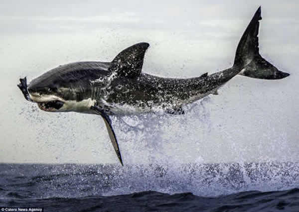 艾伦称,“当时这头长约4米的大白鲨从海里一跃而出,狠狠地咬住诱饵,大白鲨迅捷的动作使得海面上溅起众多水滴,场景十分壮观。”