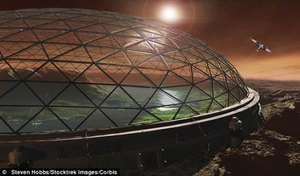 火星上具有保护作用的未来派圆顶屋设计,它显示出与马斯科一样的想法,即圆顶屋是透明的,并通过二氧化碳加压,以便火星土壤能够生长可供生命生存的庄稼